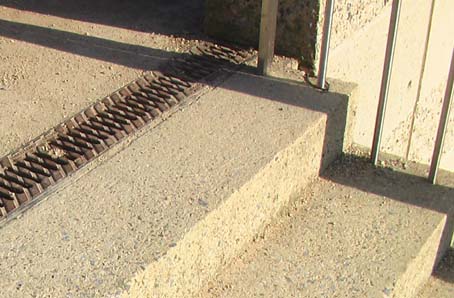 Auf Grund idyllischer Überlegungen wurde auf eine Pflasterung des so genannten Streifenparks verzichtet zugunsten einer naturverbundenen Feinbekiesung. Leider entwickelt der Feinkies eine Tendenz, nicht da zu verbleiben, wo er hingehört, sondern dem Gesetz der Schwerkraft zu folgen, was zu einer steten Verschmutzung der Treppenstufen und des gepflasterten Parkplatzes führt. |